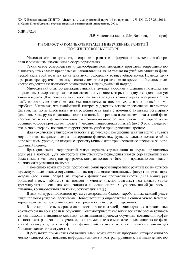 Название К вопросу о компьютеризации внеучебных занятий по физической культуре // Материалы...27 ноября - 2 декабря 2000 г. – Институт военно-технического образования и безопасности. — Ч.9