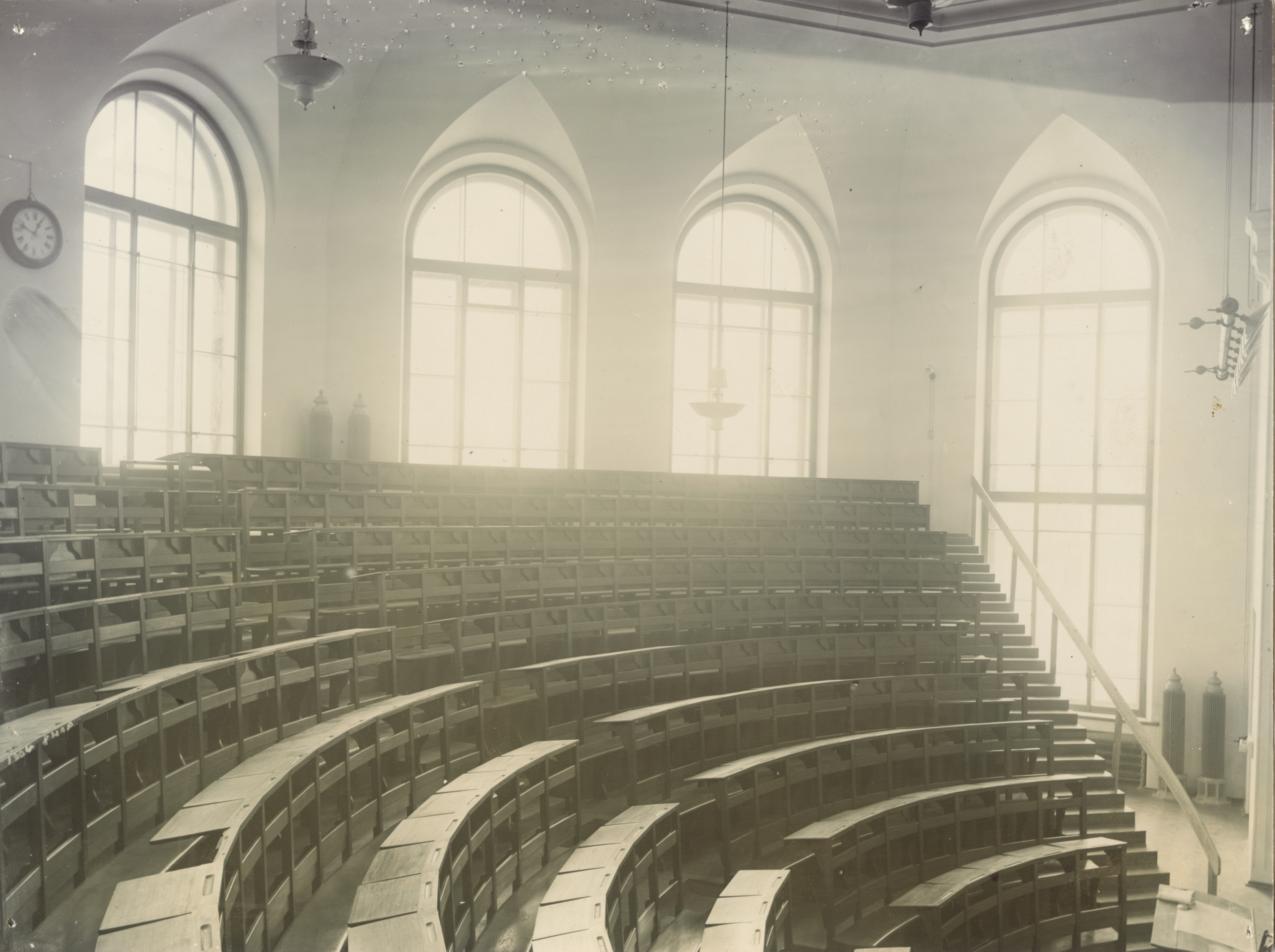 Полностью отделанное и оборудованное помещение большой физической аудитории. Скамьи для студентов, расположенные амфитеатром. Высокие арочные окна в стене. Настенные часы.