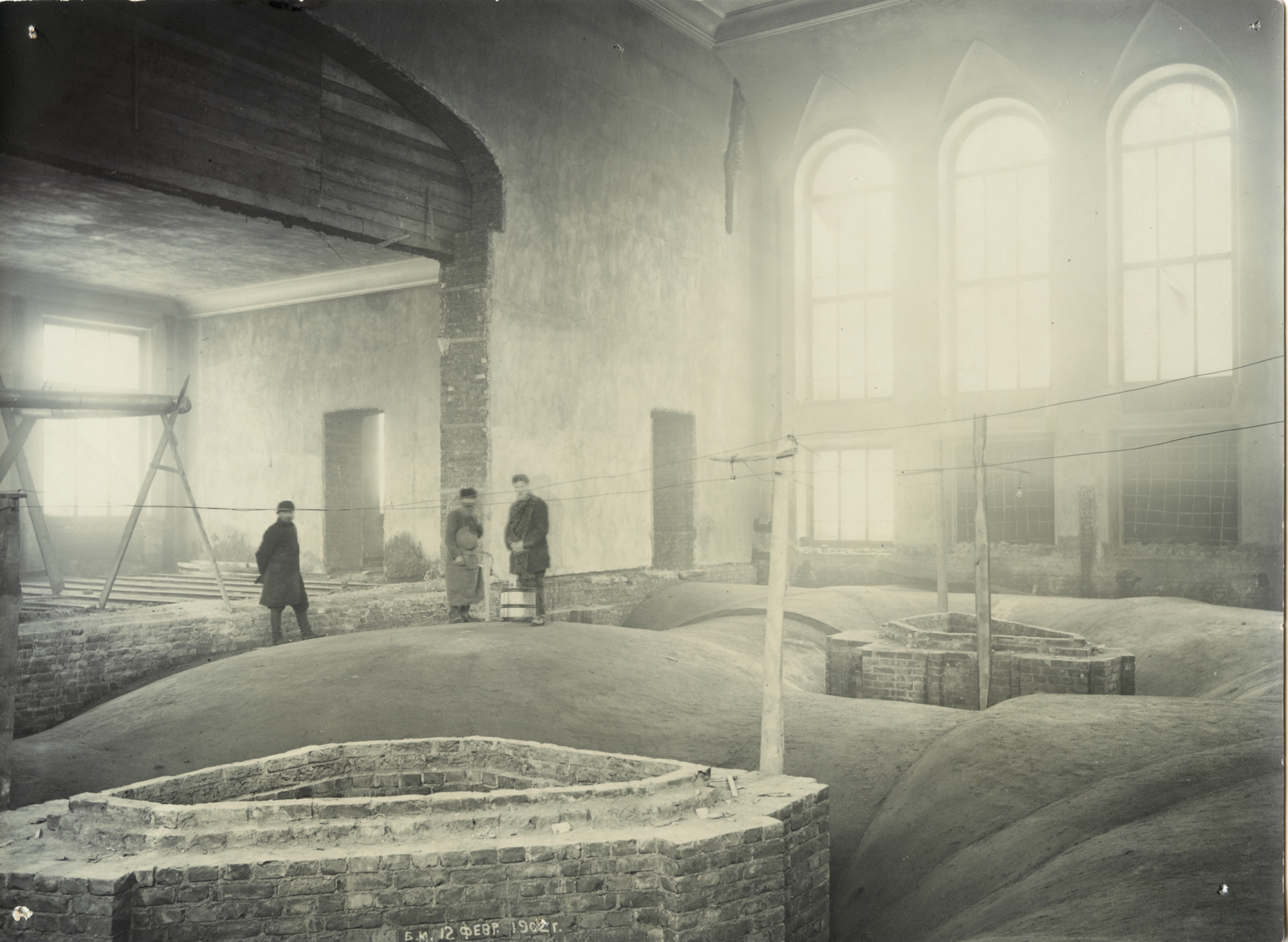 В просторном помещении главного здания ведутся строительные работы. На переднем плане - 2 кирпичных сооружения в виде колодцев с выступающими углами. Окна в 2 яруса, верхние - арочные. Незакрытый большой стенной проем, ведущий в соседнее помещение, около него стоят трое рабочих.