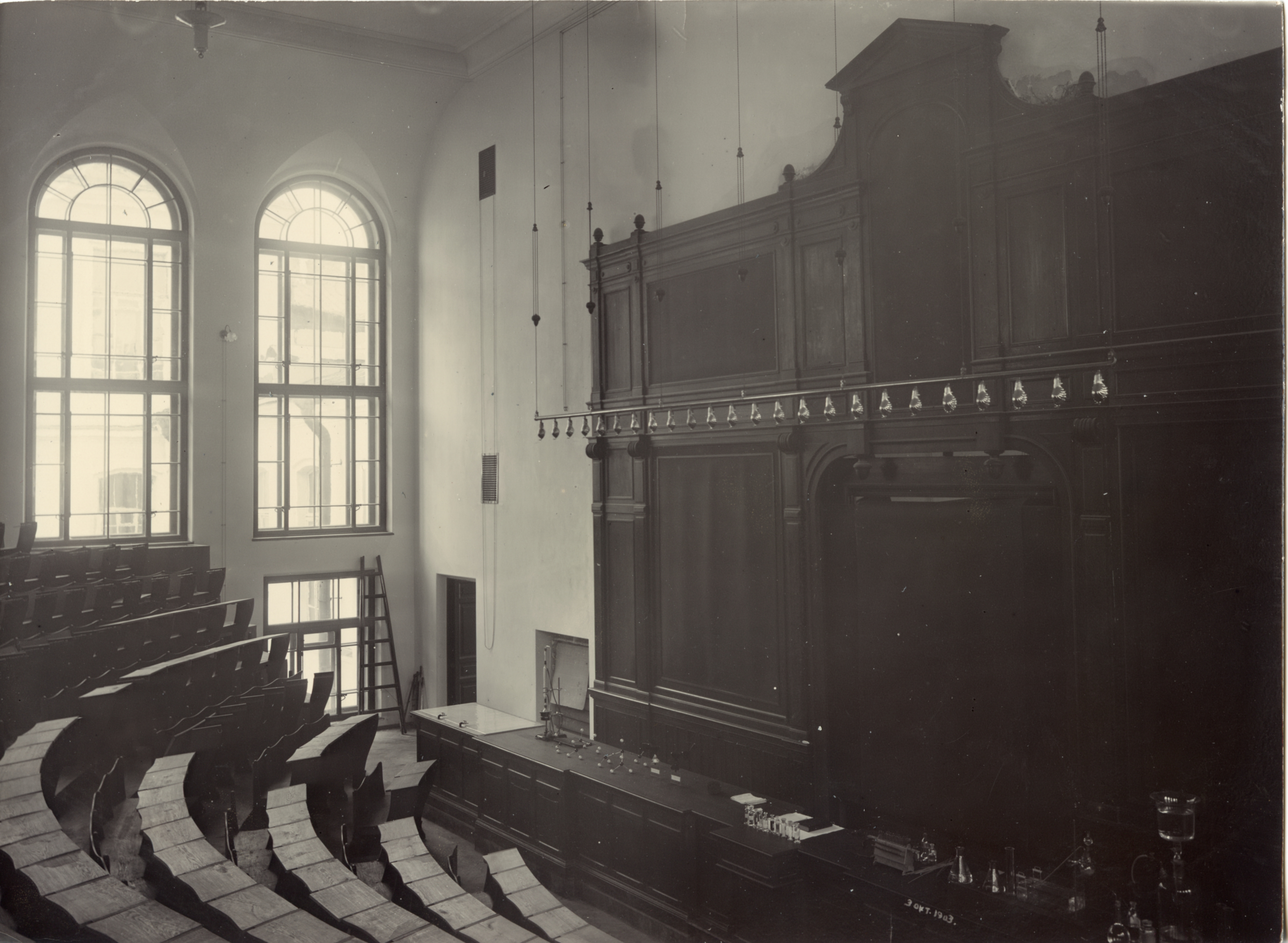 Сфотографированная с высоты верхнего ряда амфитеатра большая химическая аудитория, полностью оборудованная мебелью. На столе кафедры расставлены штативы, пробирки, колбы и пр. На заднем плане около окна стоит стремянка.