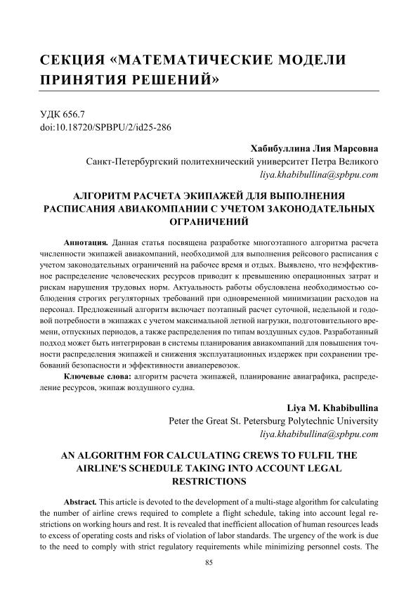 Данная статья посвящена разработке многоэтапного алгоритма расчета численности экипажей авиакомпаний, необходимой для выполнения рейсового расписания с учетом законодательных ограничений на рабочее время и отдых. Выявлено, что неэффективное распределение человеческих ресурсов приводит к превышению операционных затрат и рискам нарушения трудовых норм. Актуальность работы обусловлена необходимостью соблюдения строгих регуляторных требований при одновременной минимизации расходов на персонал. Предложенный алгоритм включает поэтапный расчет суточной, недельной и годовой потребности в экипажах с учетом максимальной летной нагрузки, подготовительного времени, отпускных периодов, а также распределения по типам воздушных судов. Разработанный подход может быть интегрирован в системы планирования авиакомпаний для повышения точности распределения экипажей и снижения эксплуатационных издержек при сохранении требований безопасности и эффективности авиаперевозок.