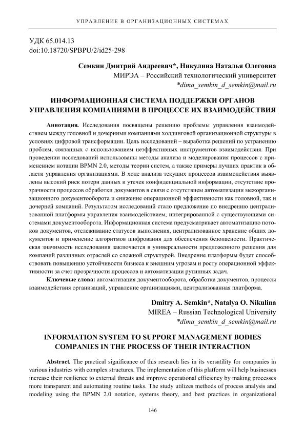 Исследования посвящены решению проблемы управления взаимодействием между головной и дочерними компаниями холдинговой организационной структуры в условиях цифровой трансформации. Цель исследований – выработка решений по устранению проблем, связанных с использованием неэффективных инструментов взаимодействия. При проведении исследований использованы методы анализа и моделирования процессов с применением нотации BPMN 2.0, методы теории систем, а также примеры лучших практик в области управления организациями. В ходе анализа текущих процессов взаимодействия выявлены высокий риск потери данных и утечек конфиденциальной информации, отсутствие прозрачности процессов обработки документов в связи с отсутствием автоматизации межорганизационного документооборота и снижение операционной эффективности как головной, так и дочерней компаний. Результатом исследований стало предложение по внедрению централизованной платформы управления взаимодействием, интегрированной с существующими системами документооборота. Информационная система предусматривает автоматизацию потоков документов, отслеживание статусов выполнения, централизованное хранение общих документов и применение алгоритмов шифрования для обеспечения безопасности. Практическая значимость исследования заключается в универсальности предложенного решения для компаний различных отраслей со сложной структурой. Внедрение платформы будет способствовать повышению устойчивости бизнеса к внешним угрозам и росту операционной эффективности за счет прозрачности процессов и автоматизации рутинных задач.