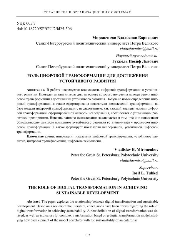 В работе исследуется взаимосвязь цифровой трансформации и устойчивого развития. Проведен анализ литературы, на основе которого получены выводы о роли цифровой трансформации в достижении устойчивого развития. Получено новое определение цифровой трансформации, а также сформированы показатели комплексной трансформации на базе модели цифровой трансформации с исследованием, как каждый элемент модели цифровой трансформации, сформированной автором исследования, соотносится с устойчивым развитием предприятия. Новизна данного исследования заключается в том, что оно показывает объединяющие факторы принципов устойчивого развития во взаимосвязи с процессом цифровой трансформации, а также формирует показатели непрерывной, устойчивой цифровой трансформации.