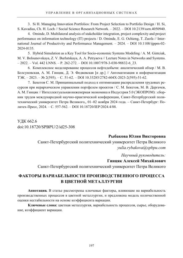 В статье рассмотрены ключевые факторы, влияющие на вариабельность производственных процессов в цветной металлургии, и предложена модель количественной оценки нестабильности на основе коэффициента вариации.