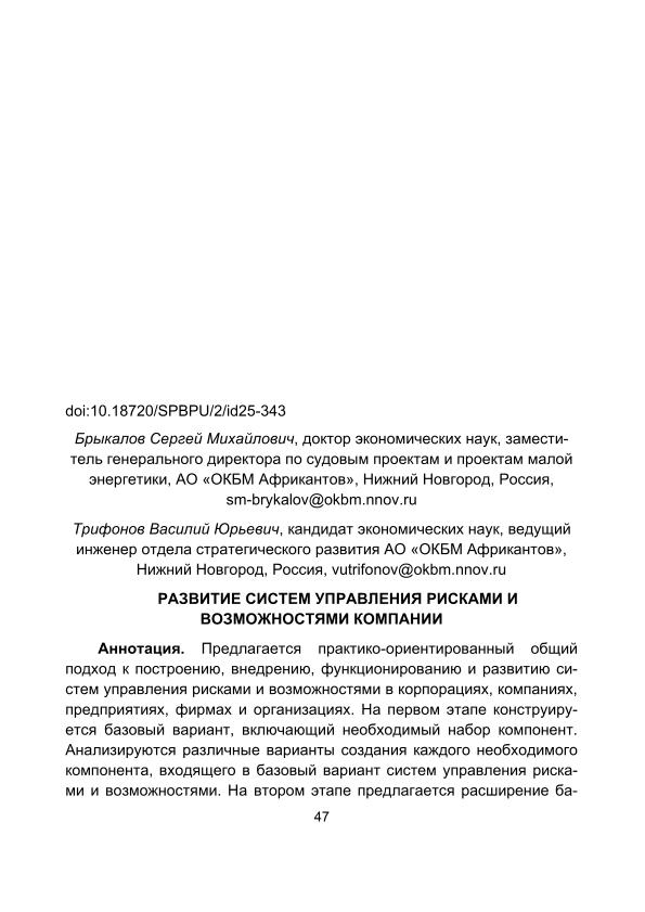 Предлагается практико-ориентированный общий подход к построению, внедрению, функционированию и развитию систем управления рисками и возможностями в корпорациях, компаниях, предприятиях, фирмах и организациях. На первом этапе конструируется базовый вариант, включающий необходимый набор компонент. Анализируются различные варианты создания каждого необходимого компонента, входящего в базовый вариант систем управления рисками и возможностями. На втором этапе предлагается расширение базового варианта путем включения в него таких дополнительных функциональных возможностей, как цифровые системы управления рисками и возможностями, её интеграция в общую систему менеджмента, идентификация ключевых рисков и возможностей и ключевых владельцев рисков, интеллектуализационных процессов управления рисками, обучение персонала и реализация стратегических мероприятий по управлению рисками. Предлагаемый практико-ориентированный подход к построению, функционированию и развитию систем управления рисками и возможностями иллюстрируется на примере крупного научно-промышленного предприятия машиностроительного дивизиона Госкорпорации «Росатом».