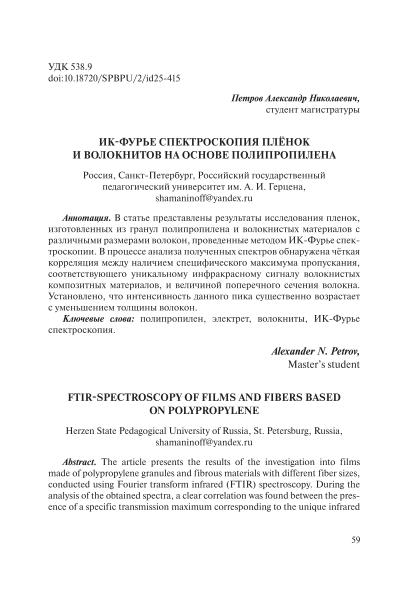 | Title | ИК-Фурье спектроскопия плёнок и волокнитов на основе полипропилена // Предмагистерская подготовка иностранных граждан: сборник статей VII межвузовской научно-практической конференции с международным участием, 21–23 июня 2025 года |