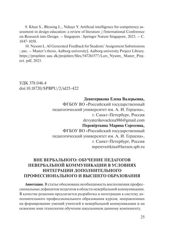 | Title | Вне вербального: обучение педагогов невербальной коммуникации в условиях интеграции дополнительного профессионального и высшего образования // Шатиловские чтения. Интеграция науки и практики в иноязычном образовании: сборник научных трудов |