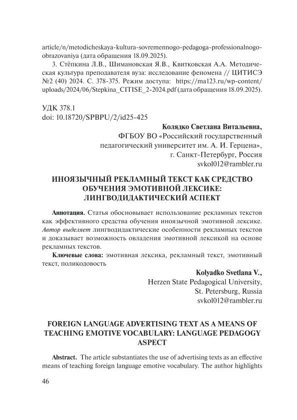 | Название | Иноязычный рекламный текст как средство обучения эмотивной лексике: лингводидактический аспект // Шатиловские чтения. Интеграция науки и практики в иноязычном образовании: сборник научных трудов |