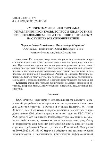 | Title | Импортозамещение в системах управления и контроля. Вопросы диагностики с использованием искусственного интеллекта на объектах электроэнергетики // Промышленный искусственный интеллект (ПИИ'2025): Всероссийская научно-практическая конференция с международным участием 3–4 июля 2025 года: cборник научных трудов |
