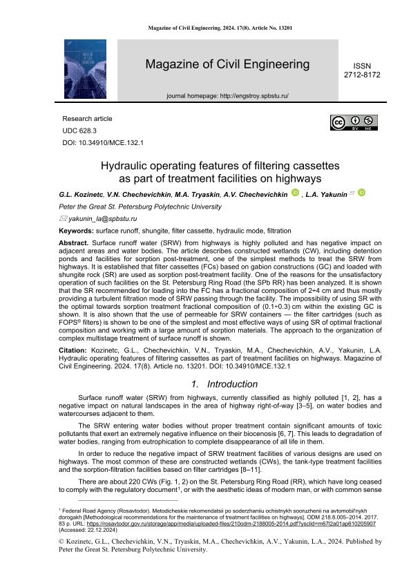 Title | Hydraulic operating features of filter cassettes as part of treatment facilities on highways // Magazine of Civil Engineering. – 2024. – Т. 17, № 8. — С. 13201 |