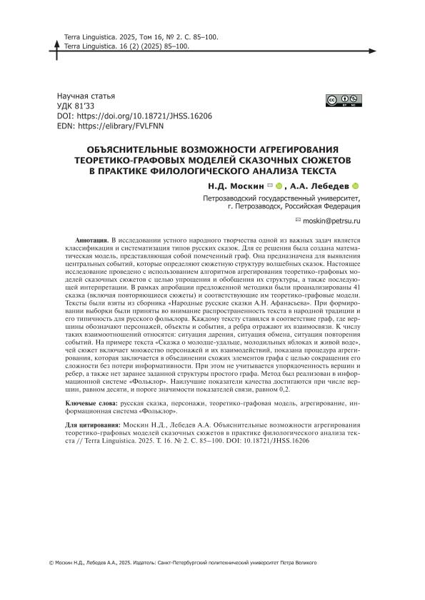 Title | Объяснительные возможности агрегирования теоретико-графовых моделей сказочных сюжетов в практике филологического анализа текста // Terra Linguistica. – 2025. – Т. 16, № 2. — С. 85-100 |