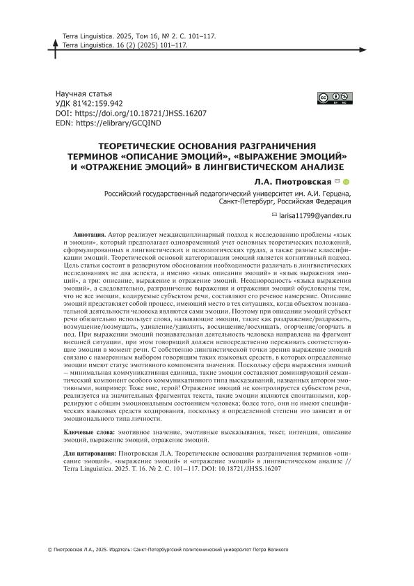 Title | Теоретические основания разграничения терминов "описание эмоций", "выражение эмоций" и "отражение эмоций" в лингвистическом анализе // Terra Linguistica. – 2025. – Т. 16, № 2. — С. 101-117 |