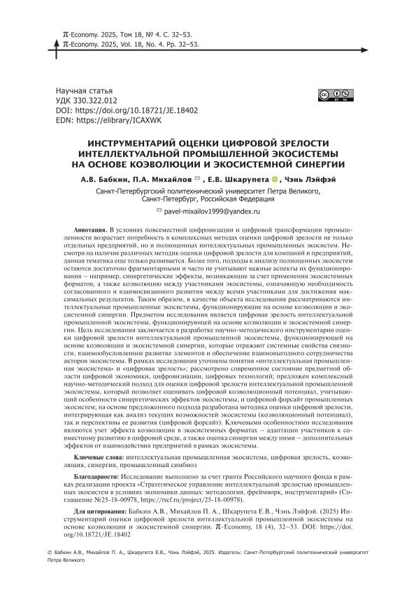 В условиях повсеместной цифровизации и цифровой трансформации промышленности возрастает потребность в комплексных методах оценки цифровой зрелости не только отдельных предприятий, но и полноценных интеллектуальных промышленных экосистем. Несмотря на наличие различных методик оценки цифровой зрелости для компаний и предприятий, данная тематика еще только развивается. Более того, подходы к анализу полноценных экосистем остаются достаточно фрагментарными и часто не учитывают важные аспекты их функционирования - например, синергетические эффекты, возникающие за счет применения экосистемных форматов, а также коэволюцию между участниками экосистемы, означающую необходимость согласованного и взаимосвязанного развития между всеми участниками для достижения максимальных результатов. Таким образом, в качестве объекта исследования рассматриваются интеллектуальные промышленные экосистемы, функционирующие на основе коэволюции и экосистемной синергии. Предметом исследования является цифровая зрелость интеллектуальной промышленной экосистемы, функционирующей на основе коэволюции и экосистемной синергии. Цель исследования заключается в разработке научно-методического инструментария оценки цифровой зрелости интеллектуальной промышленной экосистемы, функционирующей на основе коэволюции и экосистемной синергии, которые отражают системные свойства связности, взаимообусловленное развитие элементов и обеспечение взаимовыгодного сотрудничества акторов экосистемы. В рамках исследования уточнены понятия "интеллектуальная промышленная экосистема" и "цифровая зрелость"; рассмотрено современное состояние предметной области цифровой экономики, цифровизиации, цифровых технологий; предложен комплексный научно-методический подход для оценки цифровой зрелости интеллектуальной промышленной экосистемы, который позволяет оценивать цифровой коэволюционный потенциал, учитывающий особенности синергетических эффектов экосистемы, и цифровой форсайт промышленных экосистем; на основе предложенного подхода разработана методика оценки цифровой зрелости, интегрирующая как анализ текущих возможностей экосистемы (коэволюционный потенциал), так и перспективы ее развития (цифровой форсайт). Ключевыми особенностями исследования являются учет эффекта коэволюции в экосистемных форматах - адаптации участников к совместному развитию в цифровой среде, а также оценка синергии между ними - дополнительных эффектов от взаимодействия предприятий в рамках экосистемы.