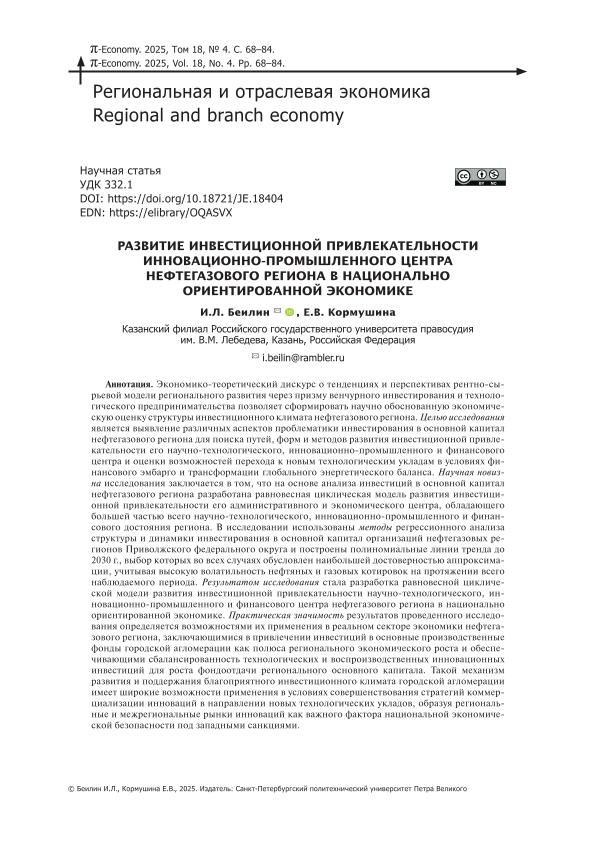 Экономико-теоретический дискурс о тенденциях и перспективах рентно-сырьевой модели регионального развития через призму венчурного инвестирования и технологического предпринимательства позволяет сформировать научно обоснованную экономическую оценку структуры инвестиционного климата нефтегазового региона. Целью исследования является выявление различных аспектов проблематики инвестирования в основной капитал нефтегазового региона для поиска путей, форм и методов развития инвестиционной привлекательности его научно-технологического, инновационно-промышленного и финансового центра и оценки возможностей перехода к новым технологическим укладам в условиях финансового эмбарго и трансформации глобального энергетического баланса. Научная новизна исследования заключается в том, что на основе анализа инвестиций в основной капитал нефтегазового региона разработана равновесная циклическая модель развития инвестиционной привлекательности его административного и экономического центра, обладающего большей частью всего научно-технологического, инновационно-промышленного и финансового достояния региона. В исследовании использованы методы регрессионного анализа структуры и динамики инвестирования в основной капитал организаций нефтегазовых регионов Приволжского федерального округа и построены полиномиальные линии тренда до 2030 г., выбор которых во всех случаях обусловлен наибольшей достоверностью аппроксимации, учитывая высокую волатильность нефтяных и газовых котировок на протяжении всего наблюдаемого периода. Результатом исследования стала разработка равновесной циклической модели развития инвестиционной привлекательности научно-технологического, инновационно-промышленного и финансового центра нефтегазового региона в национально ориентированной экономике. Практическая значимость результатов проведенного исследования определяется возможностями их применения в реальном секторе экономики нефтегазового региона, заключающимися в привлечении инвестиций в основные производственные фонды городской агломерации как полюса регионального экономического роста и обеспечивающими сбалансированность технологических и воспроизводственных инновационных инвестиций для роста фондоотдачи регионального основного капитала. Такой механизм развития и поддержания благоприятного инвестиционного климата городской агломерации имеет широкие возможности применения в условиях совершенствования стратегий коммерциализации инноваций в направлении новых технологических укладов, образуя региональные и межрегиональные рынки инноваций как важного фактора национальной экономической безопасности под западными санкциями.