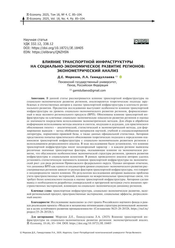 Название Влияние транспортной инфраструктуры на социально-экономическое развитие регионов: эконометрический анализ // π-Economy. – 2025. – Т. 18, № 4. — С. 85-104