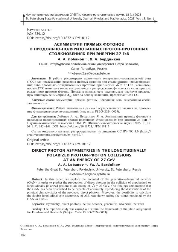 Тематика | Физика ; Элементарные частицы ; фотоны ; асимметрия прямых фотонов ; протон-протонные столкновения ; продольно-поляризованные столкновения ; нейронные сети ; генеративно-состязательные сети ; рождение прямых фотонов ; photons ; direct photon asymmetry ; proton-proton collisions ; longitudinally polarized collisions ; neural networks ; generative adversarial networks ; generation of direct photons |