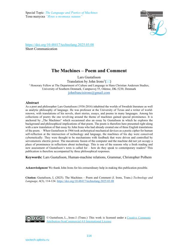 Ларс Густафссон (1936−2016), поэт и философ, глубоко проникший в мир шведской литературы и аналитической философии языка. Он был профессором Техасского университета и всемирно известным писателем, чьи романы, рассказы, эссе и стихотворения были переведены на многие языки. Среди его поэтических сборников особое место занял сборник, посвящённый теме машин. Его основой является стихотворение "Машины", которое также послужило поводом для написания эссе Густафссона, исследующего предысторию и философский подтекст этого стихотворения. Поэтому здесь стихотворение представлено вместе с новым переводом этого эссе, выполненным Джоном Айронсом, который уже создал один из трёх английских переводов стихотворения. Когда в 1966 году Густафссон взял архетипические механические устройства в качестве поэтического шифра для саморефлексии человека на стыке технологии и языка, машины его времени мыслились кибернетически: они представлялись механизмами с обратной связью, приводимыми в движение и управляемыми сервомоторной электроэнергией. Мехатронное слияние компьютера и машины ещё не занимало заметного места в размышлениях о технологиях. Это одна из причин, по которой требуется новое прочтение и новая оценка текстов Густафссона - как они воспринимаются современными читателями? Поэтому к данной публикации прилагаются три философских ответа.