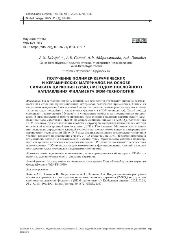 | Title | Получение полимер-керамических и керамических материалов на основе силиката циркония (ZrSiO[4]) методом послойного наплавления филамента (FDM-технология) = Production of polymer-ceramic and ceramic materials based on zirconium silicate (ZrSiO[4]) using the fused deposition modeling (FDM-techology) // Глобальная энергия. – 2025. – Т. 31, № 3. — С. 98-106 |