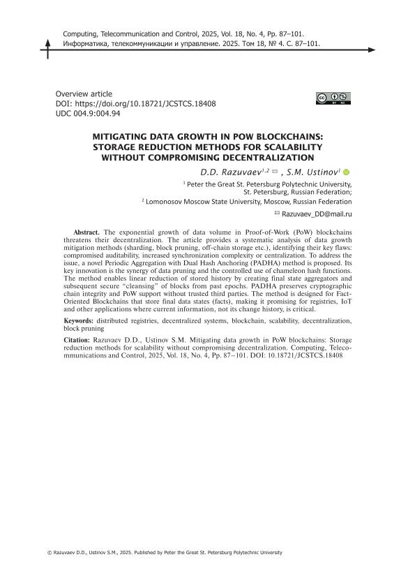 | Title | Mitigating data growth in PoW blockchains: Storage reduction methods for scalability without compromising decentralization = Оптимизация хранения данных в Proof-of-Work блокчейн-системах: методы сокращения объема и обеспечение масштабируемости в условиях децентрализации // Информатика, телекоммуникации и управление = Computing, Telecommunications and Control. – 2025. – Т. 18, № 4. — С. 87-101 |