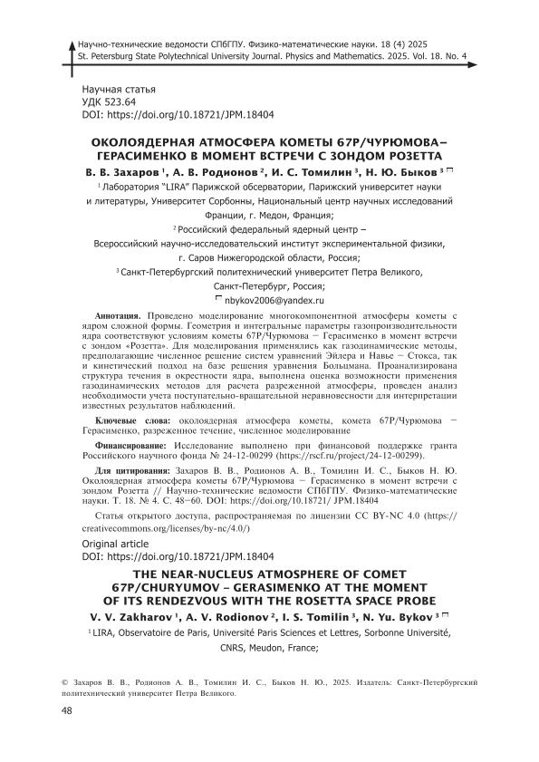 | Title | Околоядерная атмосфера кометы 67Р/Чурюмова - Герасименко в момент встречи с зондом Розетта = The near-nucleus atmosphere of comet 67P/Churyumov - Gerasimenko at the moment of its rendezvous with the Rosetta space probe // Научно-технические ведомости Санкт-Петербургского государственного политехнического университета. Сер.: Физико-математические науки. – 2025. – Т. 18, № 4. — С. 48-60 |