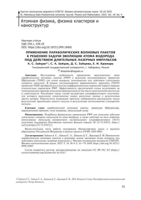 | Title | Применение параболических волновых пакетов к решению задачи эволюции атома водорода под действием длительных лазерных импульсов = Application of parabolic wave packets to solving the evolution problem of a hydrogen atom exposed to long laser pulses // Научно-технические ведомости Санкт-Петербургского государственного политехнического университета. Сер.: Физико-математические науки. – 2025. – Т. 18, № 4. — С. 61-74 |