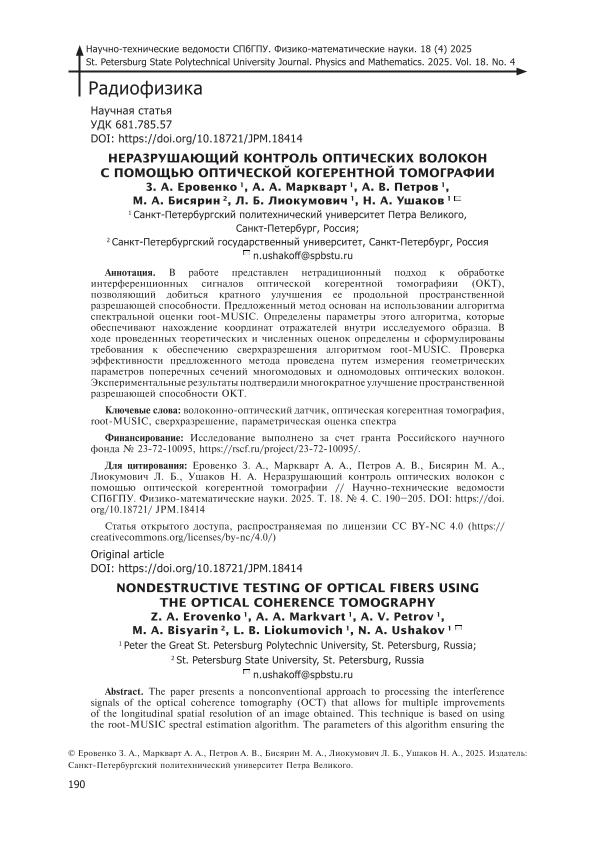 | Title | Неразрушающий контроль оптических волокон с помощью оптической когерентной томографии = Nondestructive testing of optical fibers using the optical coherence tomography // Научно-технические ведомости Санкт-Петербургского государственного политехнического университета. Сер.: Физико-математические науки. – 2025. – Т. 18, № 4. — С. 190-205 |
