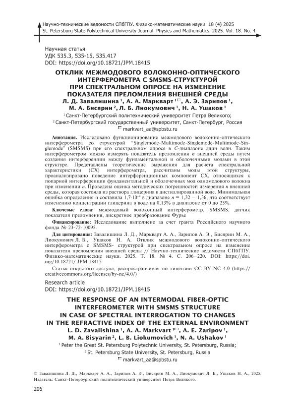 | Title | Отклик межмодового волоконно-оптического интерферометра с SMSMS- структурой при спектральном опросе на изменение показателя преломления внешней среды = The response of an intermodal fiber-optic interferometer with SMSMS structure in case of spectral interrogation to changes in the refractive index of the external environment // Научно-технические ведомости Санкт-Петербургского государственного политехнического университета. Сер.: Физико-математические науки. – 2025. – Т. 18, № 4. — С. 206-220 |