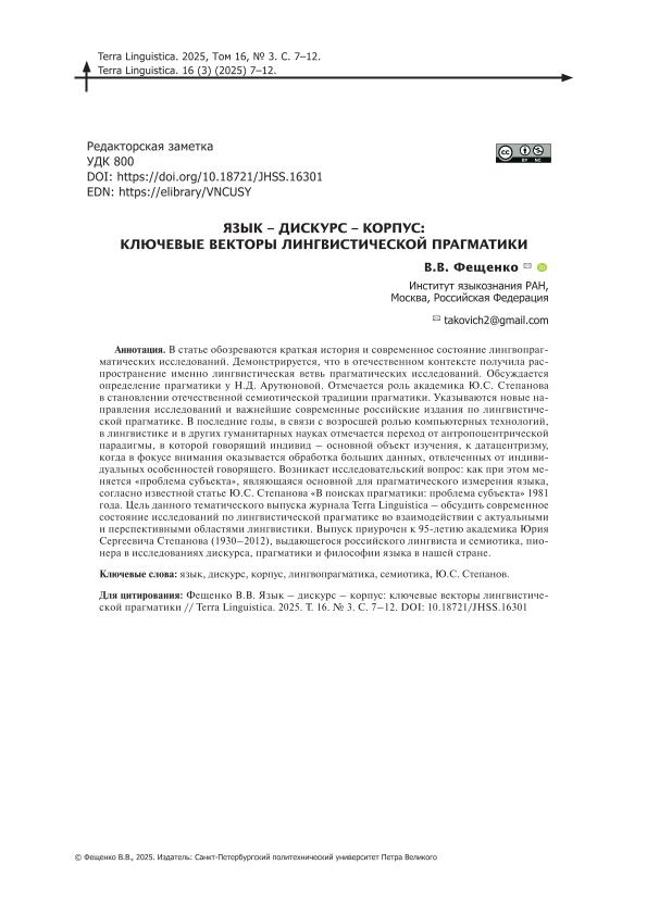 Название Язык - дискурс - корпус: ключевые векторы лингвистической прагматики // Terra Linguistica. – 2025. – Т. 16, № 3. — С. 7-12
