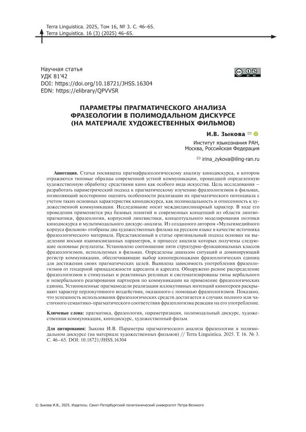 The article is devoted to the pragmaphraseological analysis of cinematic discourse. The cinematic discourse mirrors typical patterns of modern oral communication that underwent artistic processing through the means of cinema as a special form of art. The research aims to develop a parametric approach to the pragmatic study of phraseological units in films, which can provide a comprehensive assessment of their pragmatic potential, taking into account the multimodal nature of cinematic discourse and its belonging to artistic communication. The study is interdisciplinary. It applies a number of basic concepts and modern theories from the fields of linguopragmatics, phraseology, corpus linguistics, conceptual modeling of film poetics, and multimodal discourse-analysis. The source of phraseological material is two Russian-language feature films selected from the Multimedia Film Corpus created by the author. The approach elaborated in the present paper involves eight interrelated parameters. The application of this approach established the ratio of five structural-functional classes of phraseological units used in films as well as the range of situations and the dominant register of communication that ensure the characters' choice of phraseological units to achieve their pragmatic goals. The use of phraseological units may depend on the gender of the addresser and the addressee. In the films under analysis, phraseological units occur more often in reactive utterances than in stimulus utterances. The interlocutors' reactions to their use can be of three main types: both verbal and non-verbal; only verbal, and only non-verbal. The established pragmatic models revealed a correspondence between the illocutionary intentions realized through phraseological units and the achieved perlocutionary effects. As was found, the use of phraseological means is successful in cases of full or partial semantic-pragmatic accordance of a phraseological unit with the addressee’s reaction.