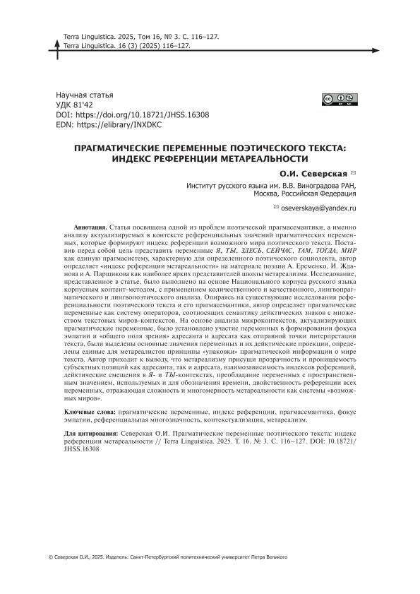 | Название | Прагматические переменные поэтического текста: индекс референции метареальности // Terra Linguistica. – 2025. – Т. 16, № 3. — С. 116-127 |