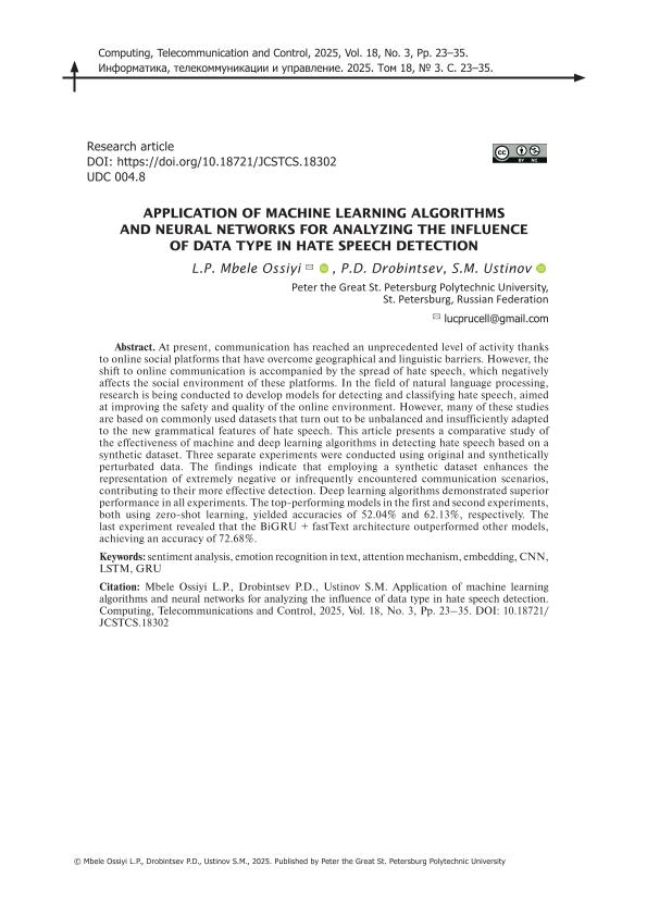 | Title | Application of machine learning algorithms and neural networks for analyzing the influence of data type in hate speech detection // Информатика, телекоммуникации и управление. – 2025. – Т. 18, № 3. — С. 23-35 |