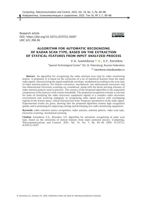 | Title | Algorithm for automatic recognizing of radar scan type, based on the extraction of statical features from input analyzed process // Информатика, телекоммуникации и управление. – 2025. – Т. 18, № 3. — С. 80-88 |