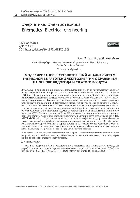| Title | Моделирование и сравнительный анализ систем гибридной выработки электроэнергии с хранением на основе водорода и сжатого воздуха = Modeling and comparative analysis of hybrid electric power generation using hydrogen and compressed air energy storages // Глобальная энергия. – 2025. – Т. 31, № 3. — С. 7-21 |