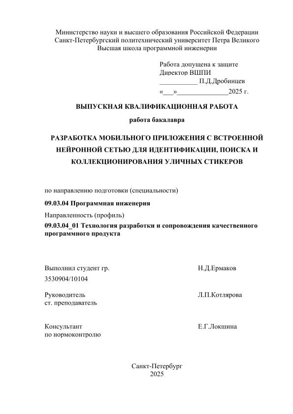 Title | Разработка мобильного приложения с встроенной нейронной сетью для идентификации, поиска и коллекционирования уличных стикеров: выпускная квалификационная работа бакалавра: направление 09.03.04 «Программная инженерия» ; образовательная программа 09.03.04_01 «Технология разработки и сопровождения качественного программного продукта» |