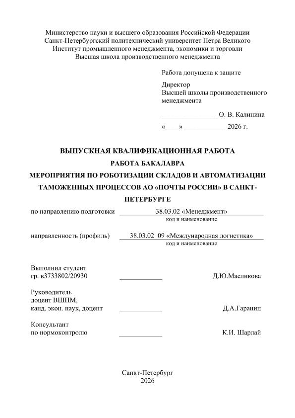 The given work is devoted to develop and substantiate measures for warehouse robotics and customs process automation using digital, analytical, and modeling tools, based on the example of JSC Russian Post operations in Saint Petersburg. The research set the following goals: – analyze the specific features of JSC Russian Post operations in Saint Petersburg, including warehouse management and customs clearance of international mail (IMO); – identify key problem areas in the organizational and functional structure of the customs-logistics system in the region; – develop proposals for the application of robotic systems to optimize operations under peak load conditions. The work was fulfilled on the premises of the Automated Sorting Center of JSC Russian Post in Saint Petersburg. Research methods: analysis and synthesis of scientific and regulatory sources, logistical and economic analysis, systemic and process approaches, modeling and optimization methods for customs and warehouse processes, risk analysis methods, digital modeling, forecasting, and decision support methods in logistics. All objectives of the bachelors thesis have been fulfilled, and the research goal has been achieved. The obtained results possess practical significance and can be applied to the optimization of warehouse and customs processes under conditions of digital transformation. Scope of application of the results: JSC Russian Post operations in Saint Petersburg, other branches of the company, as well as logistics operators handling international shipments across the Russian Federation. Digital technologies and software used: internet resources, Microsoft Word, Microsoft Excel, corporate information systems (WMS, EAEU Customs Information System).