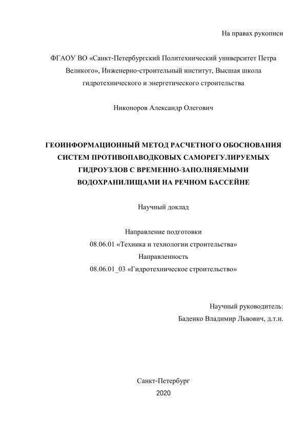 | Title | Геоинформационный метод расчетного обоснования систем противопаводковых саморегулируемых гидроузлов с временно-заполняемыми водохранилищами на речном бассейне: научный доклад: направление подготовки 08.06.01 «Техника и технологии строительства» ; направленность 08.06.01_03 «Гидротехническое строительство» = Geoinformational method for estimation of systems of self-regulating flood dams with temporarily filled reservoirs in a river basin |