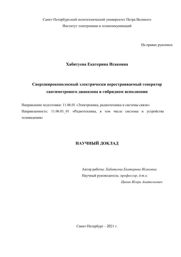 Title Сверхширокополосный электрически перестраиваемый генератор сантиметрового диапазона в гибридном исполнении: научный доклад: направление подготовки 11.06.01 «Электроника, радиотехника и системы связи» ; направленность 11.06.01_01 «Радиотехника, в том числе системы и устройства телевидения» = Ultra-wideband microwave voltage-controlled oscillator based on hybrid technology