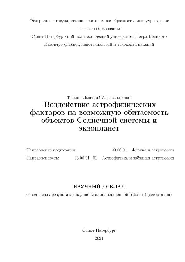 | Название | Воздействие астрофизических факторов на возможную обитаемость объектов солнечной Cистемы и экзопланет: научный доклад: направление подготовки 03.06.01 «Физика и астрономия» ; направленность 03.06.01_01 «Астрофизика и звездная астрономия» = Influence of astrophysical factors on the presumed habitability of Solar system bodies and exoplanets |