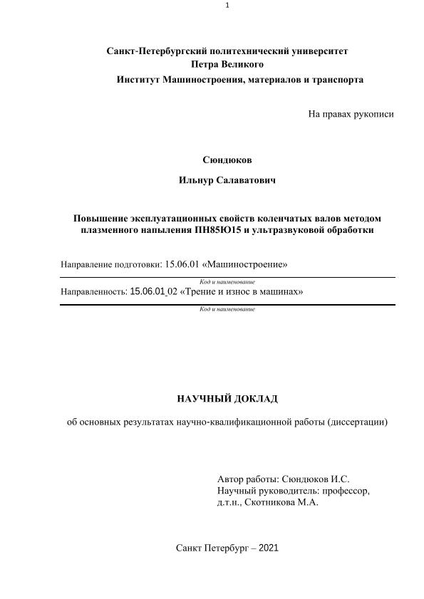 | Title | Повышение эксплуатационных свойств коленчатых валов методом плазменного напыления ПН85Ю15 и ультразвуковой обработки: научный доклад: направление подготовки 15.06.01 «Машиностроение» ; направленность 15.06.01_02 «Трение и износ в машинах» = Improving the operational properties of crankshafts by plasma spraying PN85Y15 and ultrasonic treatment |
