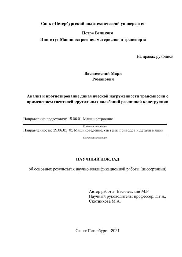 | Title | Анализ и прогнозирование динамической нагруженности трансмиссии с применением гасителей крутильных колебаний различной конструкции: научный доклад: направление подготовки 15.06.01 «Машиностроение» ; направленность 15.06.01_01 «Машиноведение, системы приводов и детали машин» = Analysis and prediction of the dynamic load of the transmission using torsional vibration dampers of various designs |