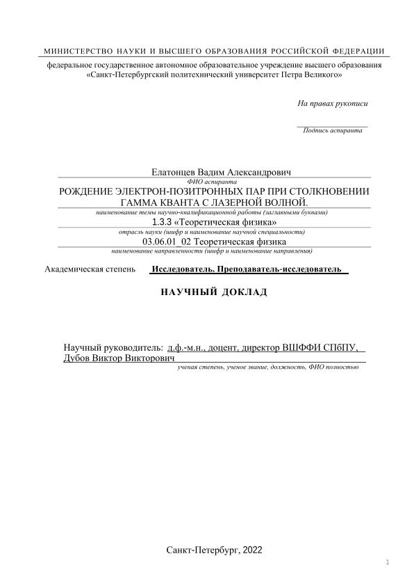 | Title | Рождение электрон-позитронных пар при столкновении гамма кванта с лазерной волной: научный доклад: направление подготовки 03.06.01 «Физика и астрономия» ; направленность 03.06.01_02 «Теоретическая физика» = Production of electron–positron pair in the collision of a gamma quantum with a laser wave |