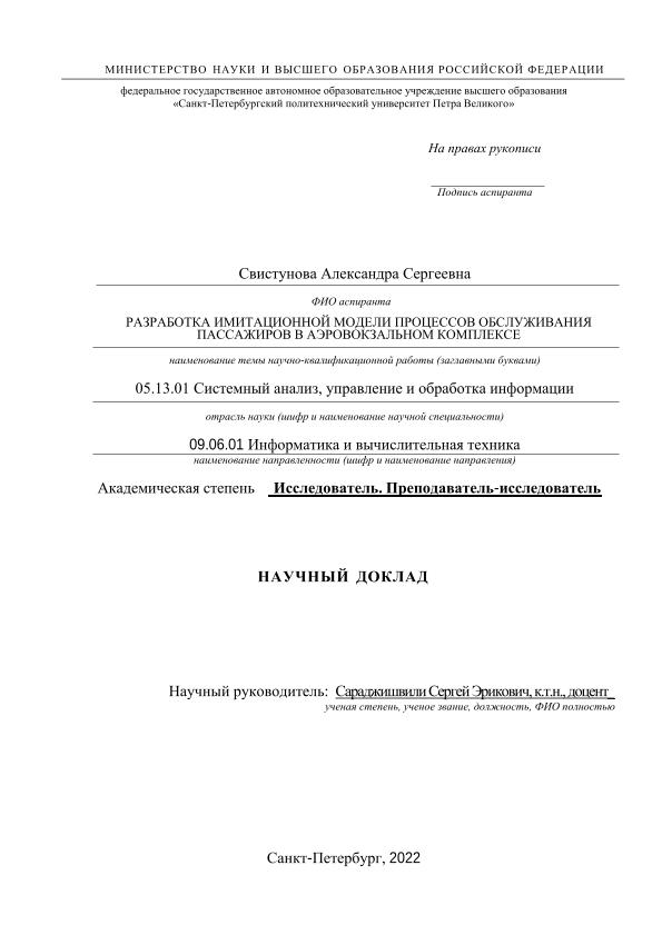 | Title | Разработка имитационной модели процессов обслуживания пассажиров в аэровокзальном комплексе: научный доклад: направление подготовки 09.06.01 «Информатика и вычислительная техника» ; направленность 09.06.01_02 «Системный анализ, управление и обработка информации (по отраслям)» = Development of a simulation model of passenger service processes in the airport complex |